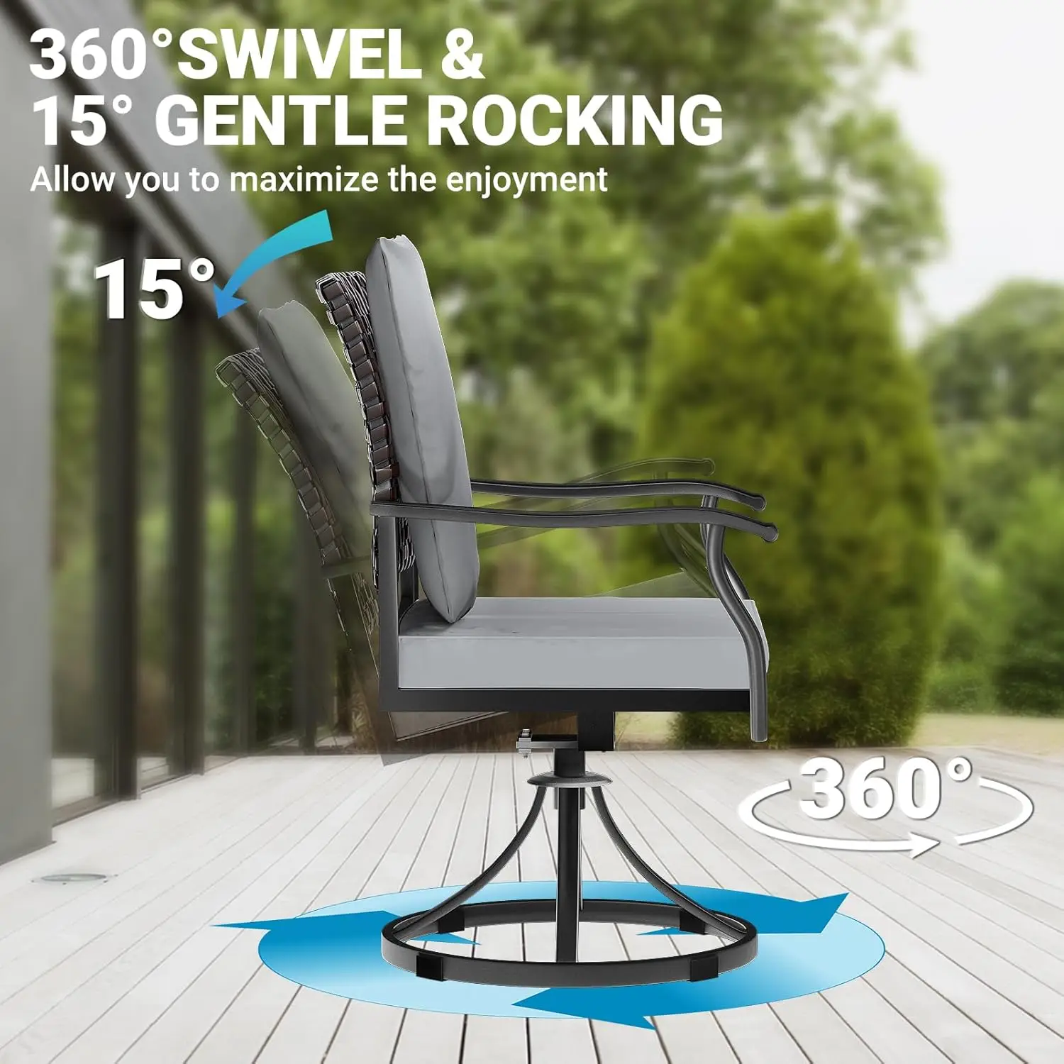 The swivel chairs provide 360-degree rotation for ease of movement and a relaxed dining experience, while the large round table offers ample space for meals, drinks, or outdoor décor. Crafted with weather-resistant materials, this dining set is built to withstand sun, rain, and outdoor conditions while remaining durable and low-maintenance. Its elegant design fits any outdoor setting, offering both modern style and practical comfort.